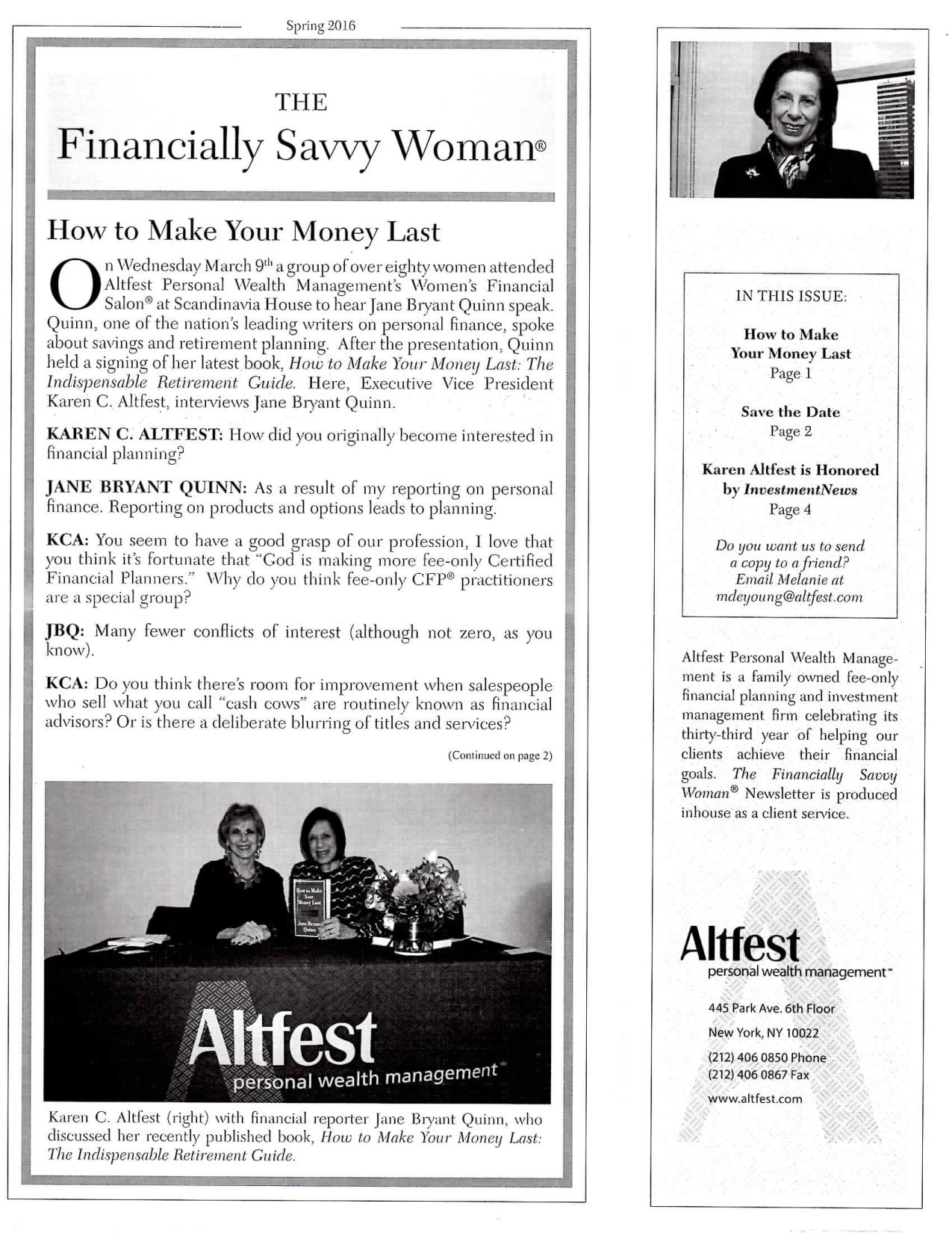 The Spring 2016 edition of The Financially Savvy Woman™ newsletter features an interview with Jane Bryant Quinn, one of the nation’s leading writers on personal finance. Her latest book, How to Make Your Money Last: The Indispensable Retirement Guide delves into many issues that women often encounter.